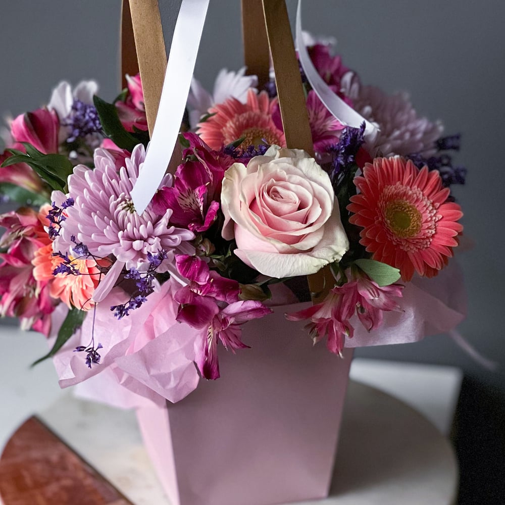 Bouquet features set of different flowers in the pink-beige color palette. The size is Small. The high is 25cm. Note: We are working with the fresh seasonable flowers, so the composition of the bouquet may a bit vary. Even in the absence of a seasonal flower - we try to collect a bouquet as similar as possible. If a particular flower is important for you - please, contact us with the note and we will agree on the options with you.
