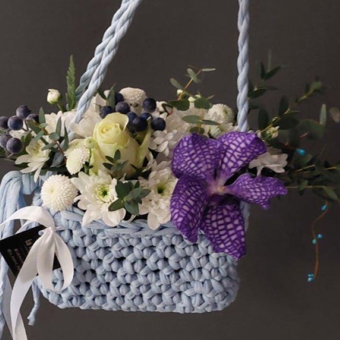 The combination of an orchid with a rose and a chrysanthemum in a hand-knitted womens purse makes this combination an ideal choice both for a romantic date and for any kind of celebration. Note: th...