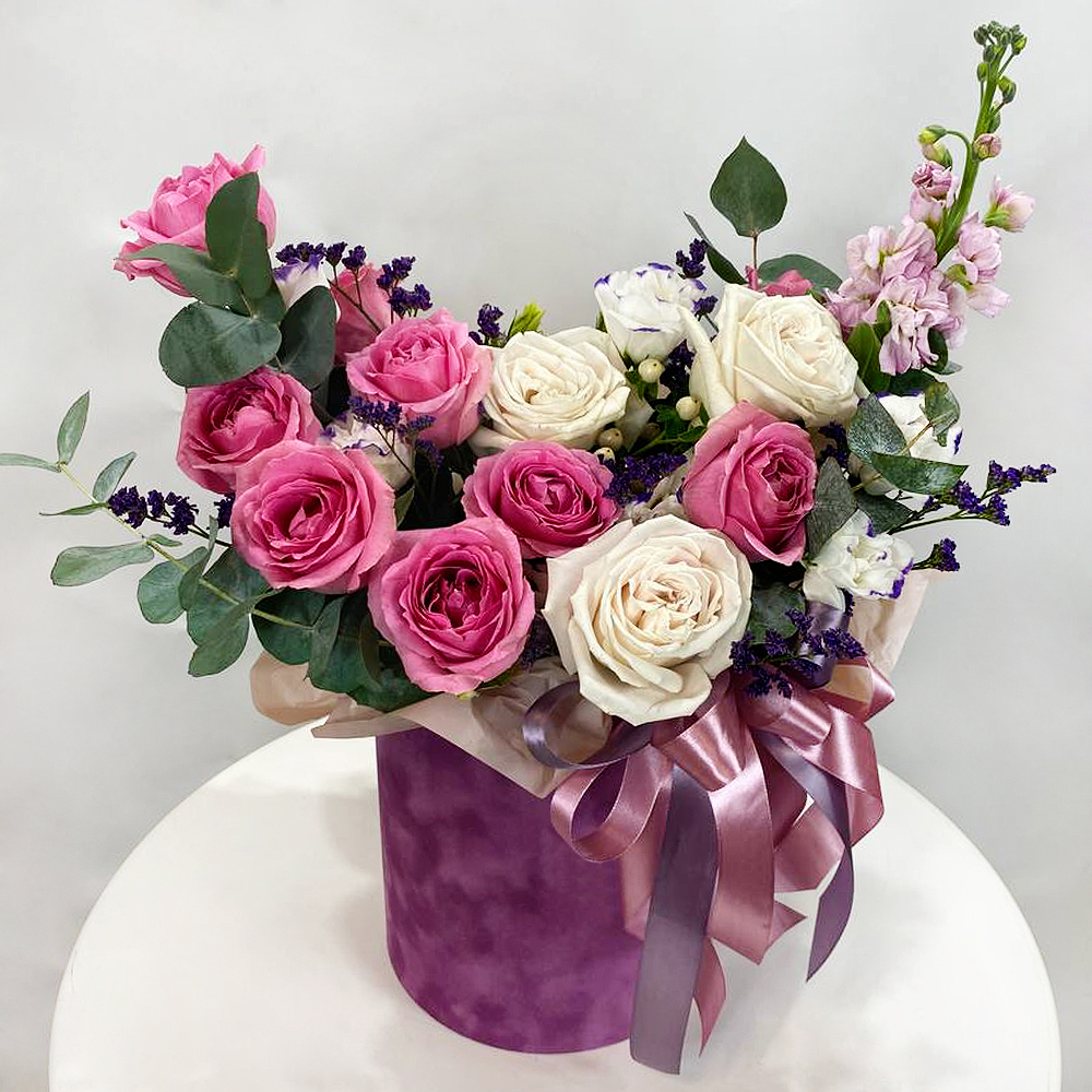 The bouquet "Tender Kiss" is the perfect gift for any occasion. It combines elegance and tenderness, creating an atmosphere of coziness and warmth. In this bouquet, arranged in a stylish hat box, pink and white roses, stock flowers, lisianthus, limonium, hypericum, and eucalyptus "Cineraria" are harmoniously combined. Each flower has its own meaning: pink roses symbolize gratitude and appreciation, white roses represent purity and innocence, stocks convey modesty and tranquility, lisianthus signifies carefreeness and simplicity, limonium adds freshness and volume to the bouquet, hypericum gives it brightness and richness, and eucalyptus "Cineraria" fills the bouquet with a delicate fragrance. The "Tender Kiss" bouquet is created by experienced florists using only fresh flowers. It will delight the recipient with its beauty and fragrance for several days.