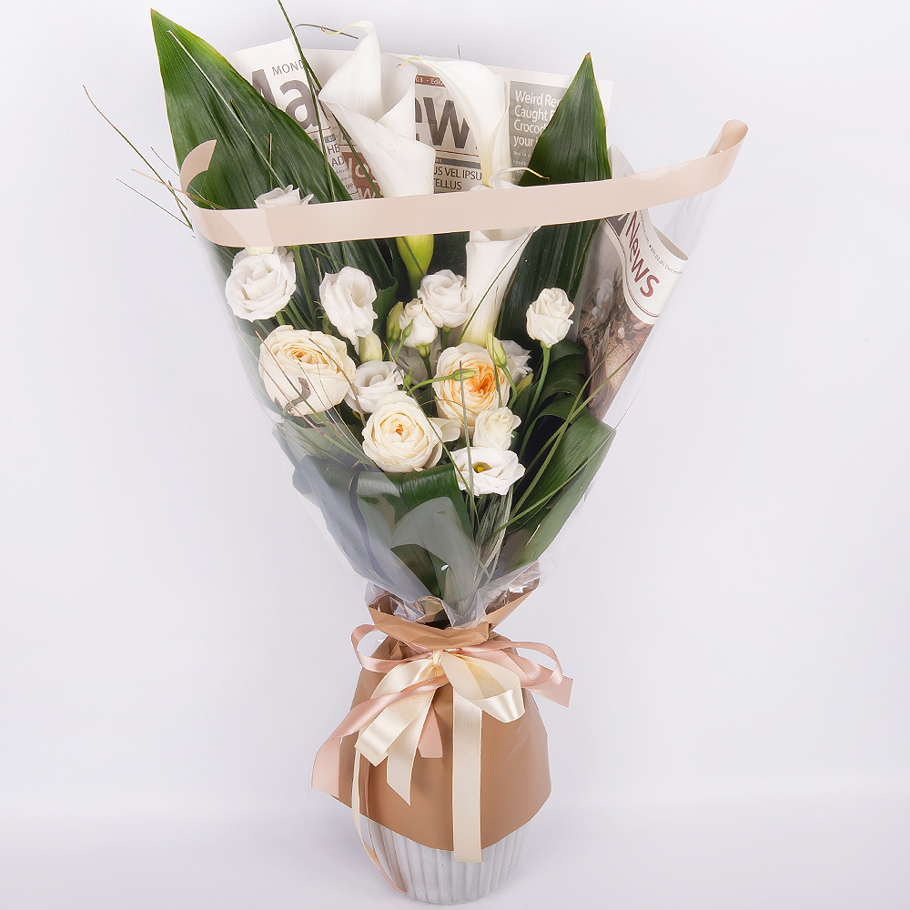 The bouquet "Delicate Pattern" is an exquisite combination of callas, peony roses, lisianthus, bear grass, and aspidistra, which will give the recipient a feeling of tenderness and harmony. The "Delicate Pattern" bouquet is created by experienced florists using only fresh flowers. It will delight the recipient with its beauty and fragrance for several days. The "Delicate Pattern" bouquet will make a wonderful gift for a birthday, wedding, anniversary, or as a sign of attention or gratitude. This bouquet is not only beautiful but also unique. It combines different shades and shapes, creating a unique pattern that will emphasize your care and attention. The "Delicate Pattern" bouquet is packed in stylish packaging, making it even more convenient and practical as a gift.