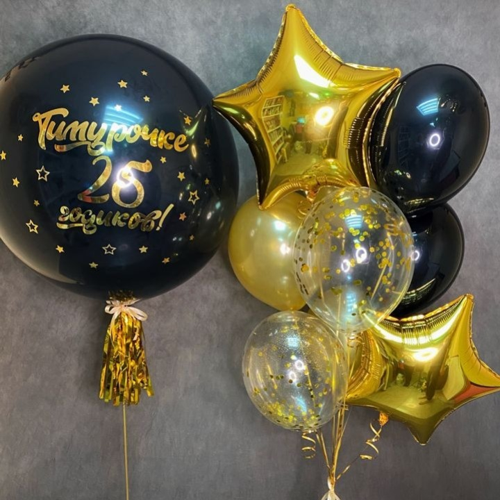 Giant balloon with black and gold fountain of balloons