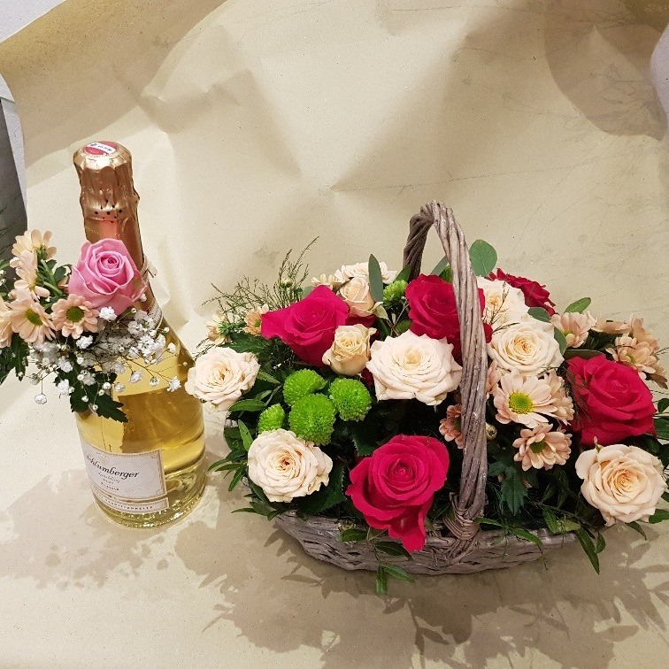 Champagne bottle with flower arrangement