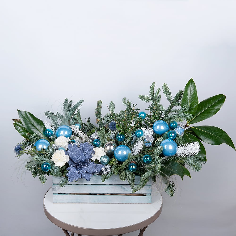 This composition in cool blue and silver tones evokes snowy winter landscapes. Frosted fir branches, shimmering ornaments, and greenery create a sense of freshness. The decorative planter makes the arrangement a stylish and elegant addition to your interior.