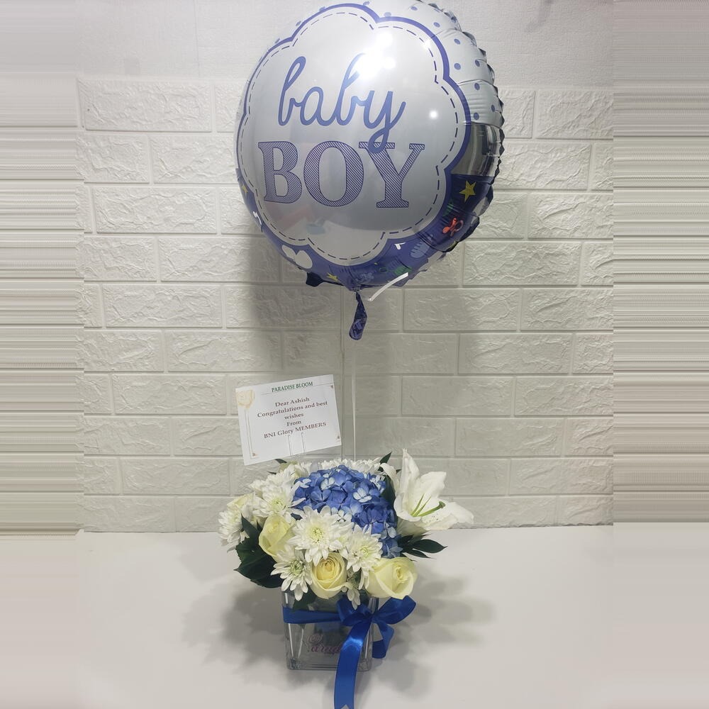 white chrysanthemum - 3 pcs blue hydrangea - 1 pcs white lily - 1 pcs white roses - 5 pcs helium balloon - 1 pcs