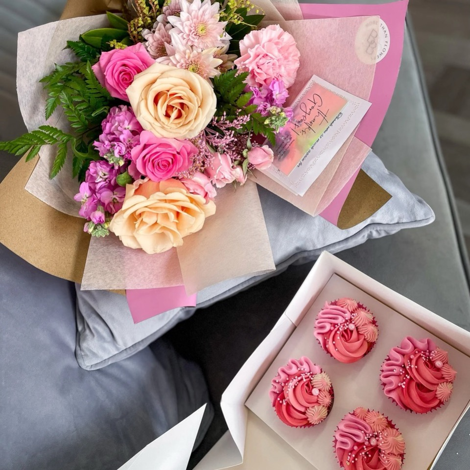 A delightful pairing of beauty and sweetness - our set includes a charming cute bouquet and four delicious cupcakes, perfect for adding a touch of joy to any celebration.