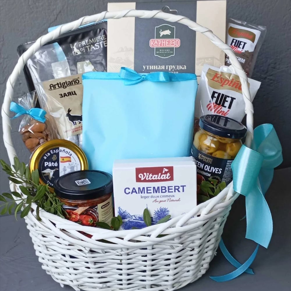 Грудка утки свровяленая в вакуумной упаковке 1 шт, мясо риет сыровяленое в вакуумной упаковке 1 шт, сыр полутвердый нарезка 1 шт, сыр Бри 1 шт, колбаски фуэт мини 3 вида, паштет утиный 1 шт, оливки з…