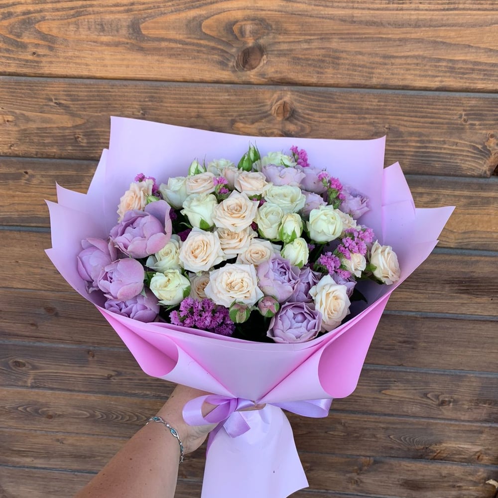 Delicate bouquet in lavender cream color. Shrub peony roses perfectly complement this bouquet and give it its zest.