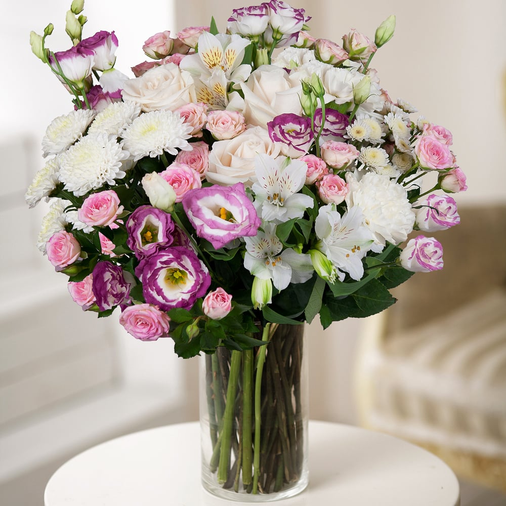 Embark on a dreamy journey with the Lavender Serenade bouquet. Pristine white roses, charming spray roses, graceful alstroemeria, lisianthus, a spray Chrysanthemum Stallion, and a Chrysanthemum spray create a captivating composition. Adorned with a charming ribbon, this bouquet evokes a sense of serenity and elegance. Lavender Serenade is a gift that will transport your loved ones to a realm of tranquility and sweet dreams.
