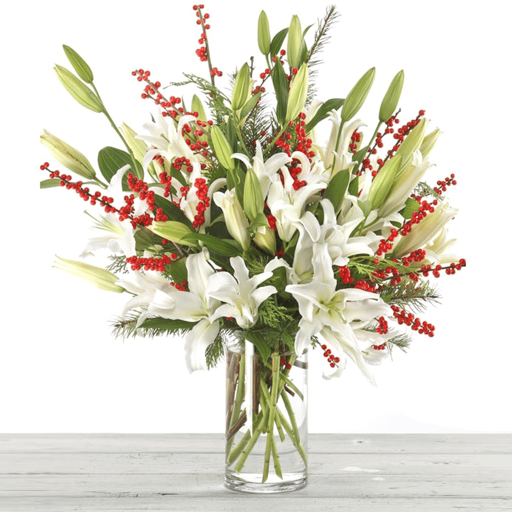 The arrangement features a tall, clear glass vase filled with long green stems supporting an abundant bouquet of white lilies—some fully open, others still in bud form. Interspersed among the lilies are clusters of vivid red berries, likely winterberries (ilex), adding a striking contrast to the white petals. The foliage includes lush green leaves and sprigs of evergreen, giving the arrangement a fresh, seasonal, slightly festive feel. The bouquet is full, elegant, and visually balanced, with the white lilies creating soft, flowing shapes while the red berries add pops of color and texture.