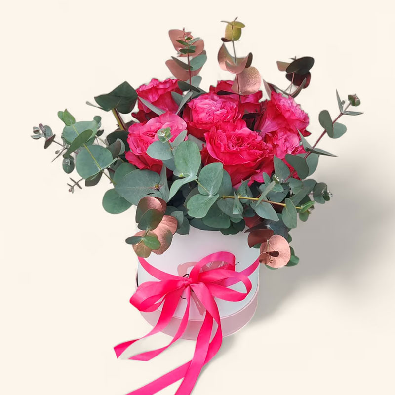 Perfect present with roses and eucalyptus.