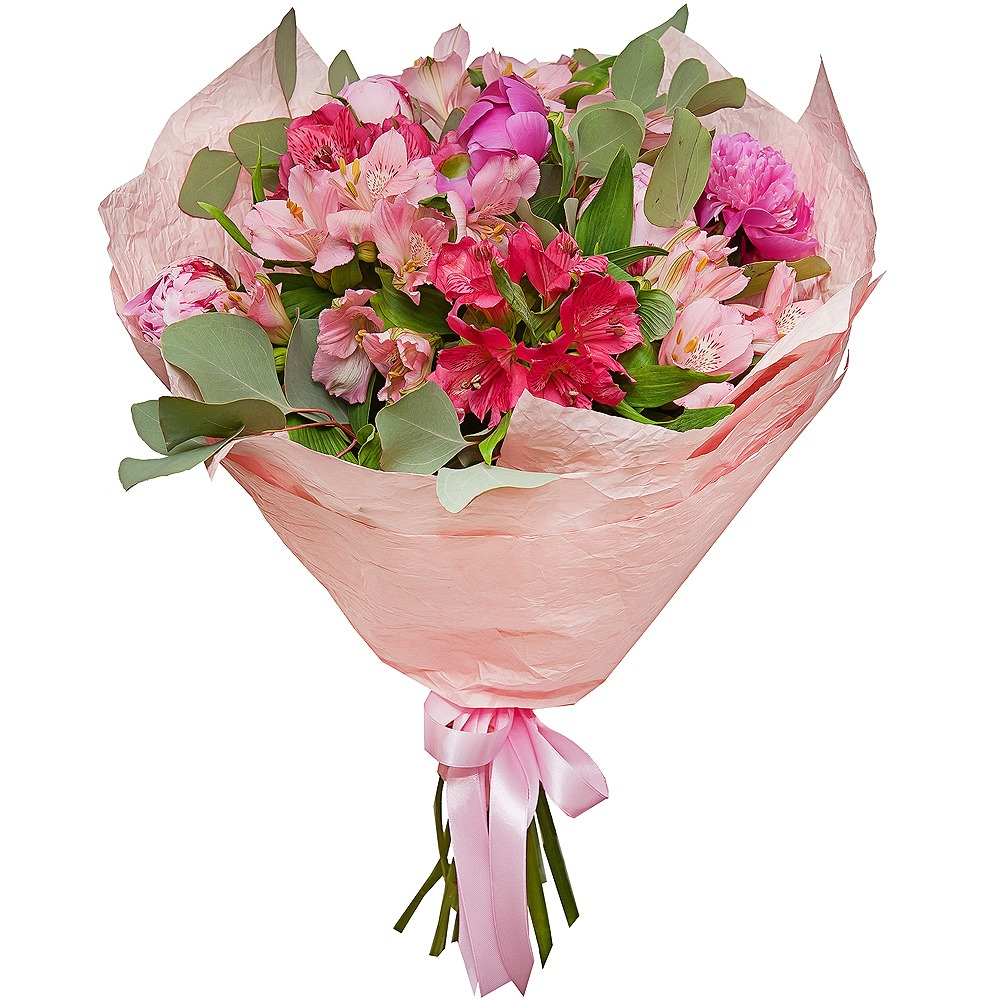 Tender and romantic arrangement of pink peonies and multicolored alstroemerias will make a perfect gift for any occasion!