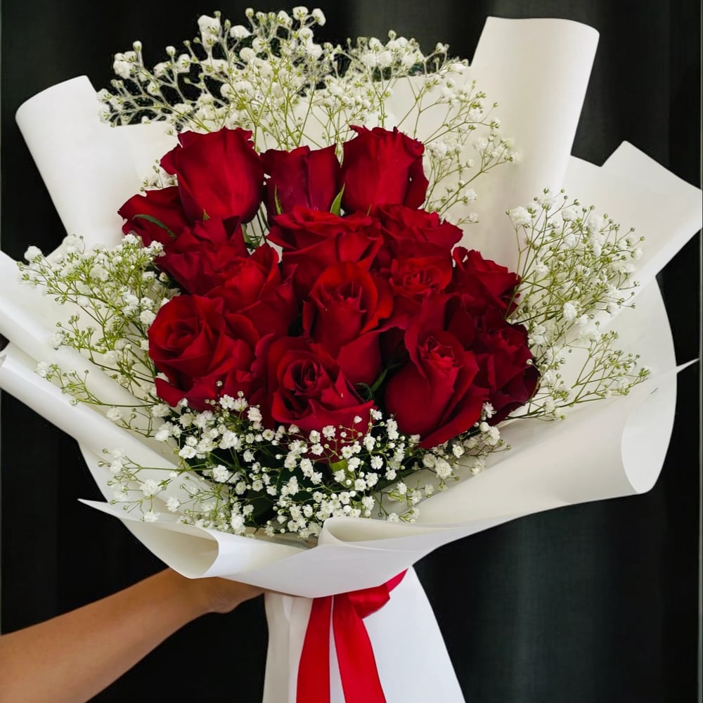 A beautifully wrapped bouquet featuring 17 red roses and 7 stems of white baby's breath.