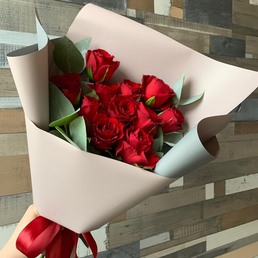 Fresh red roses with eucalyptus in a stylish design.