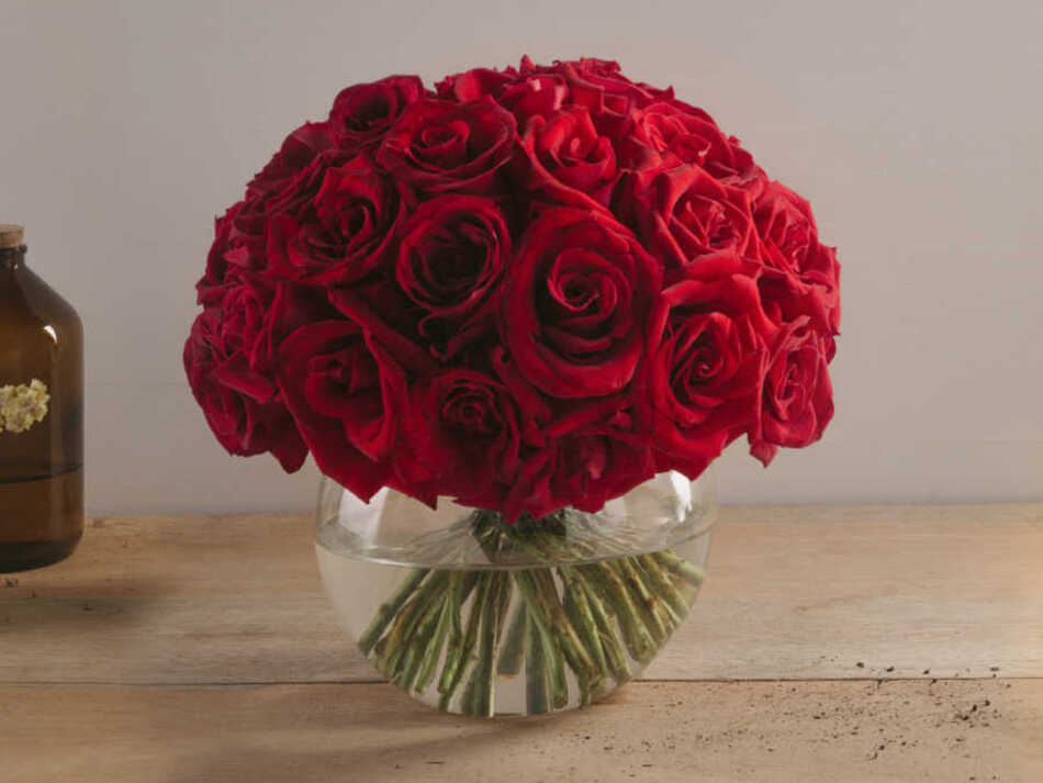 Explosion of love in roses. A beautiful arrangement with 25 red National Roses in a round semi-crystal vase. This gift will be delivered in an exclusive Flores Online packaging.