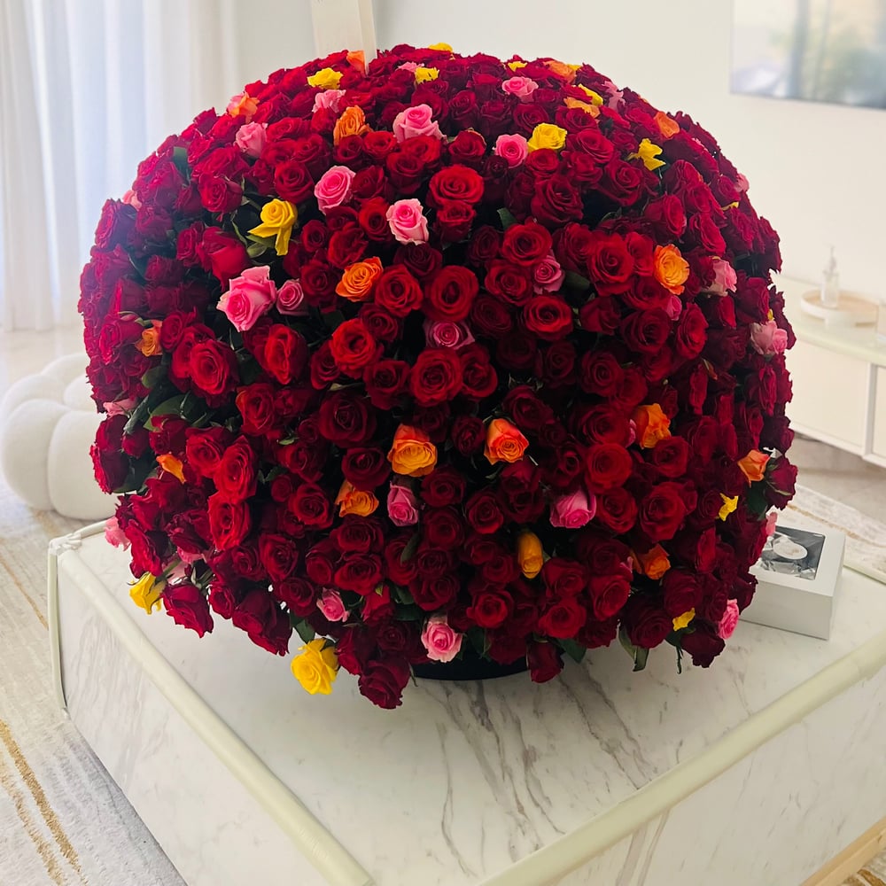 Flower box arrangement of 1,001 roses: 851 red roses, 50 pink roses, 50 yellow roses, and 50 orange roses.