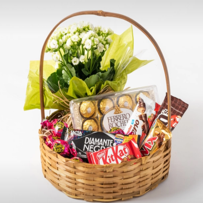 A delightful breakfast basket filled with a variety of treats. It includes assorted chocolates, Sonho de Valsa bonbons, chocolate bars, and a delicate flower arrangement.