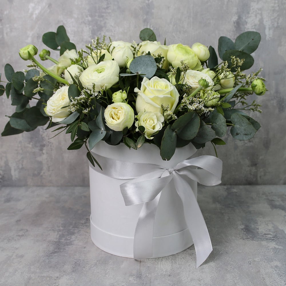 Hat box with flowers 'Marshmallow'