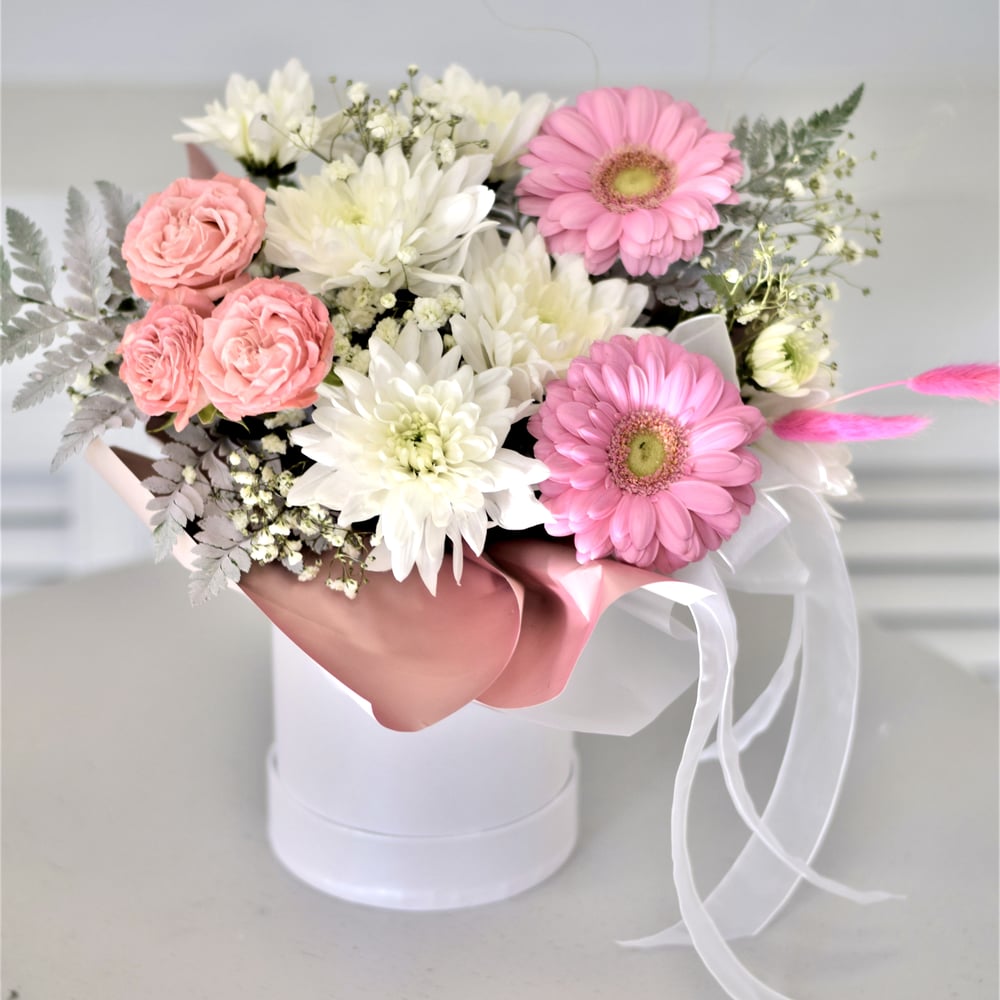 Hat box with flowers 'Merry gerberas'