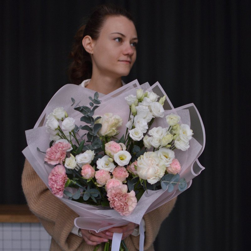 mixed bouquet with rose, spray rose, lisianthus, carnation, eucalyptus