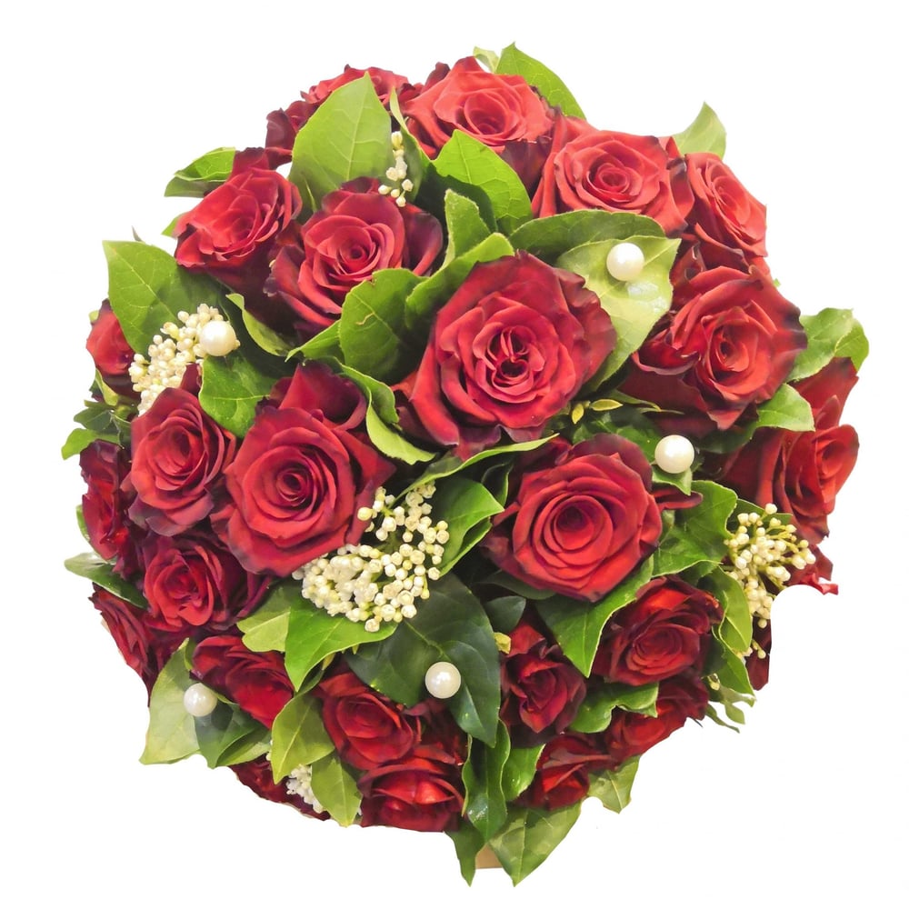 Elegant round bouquet of red roses of good quality, composed with foliage and some white flowers of season.