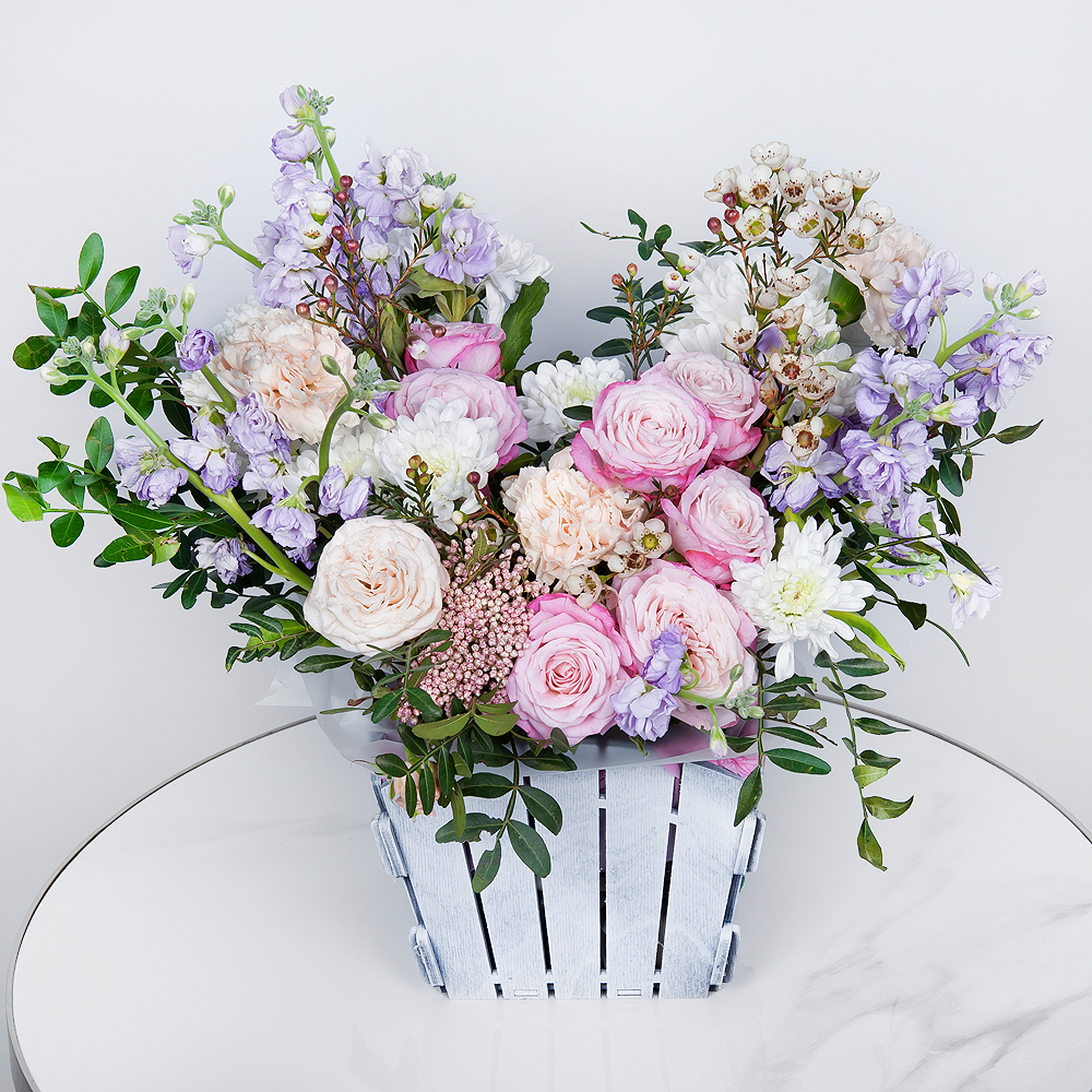 The bouquet "Morning in the Flower Garden" is a true work of art, created from the most exquisite flowers. The bouquet combines carnations, peony-like bush roses, matthiola, ozothamnus, bush chrysanthemums, waxflower, and pistachio. Together they create a unique atmosphere of a morning garden, where each flower awakens the senses and brings joy. The "Morning in the Flower Garden" bouquet will make a wonderful gift for any occasion. It is suitable for a birthday, anniversary, wedding anniversary, or any other celebration. The bouquet is placed in a wooden cachepot, which harmoniously complements the composition and gives it a special charm. Order the "Morning in the Flower Garden" bouquet and give yourself or your loved ones unforgettable emotions!
