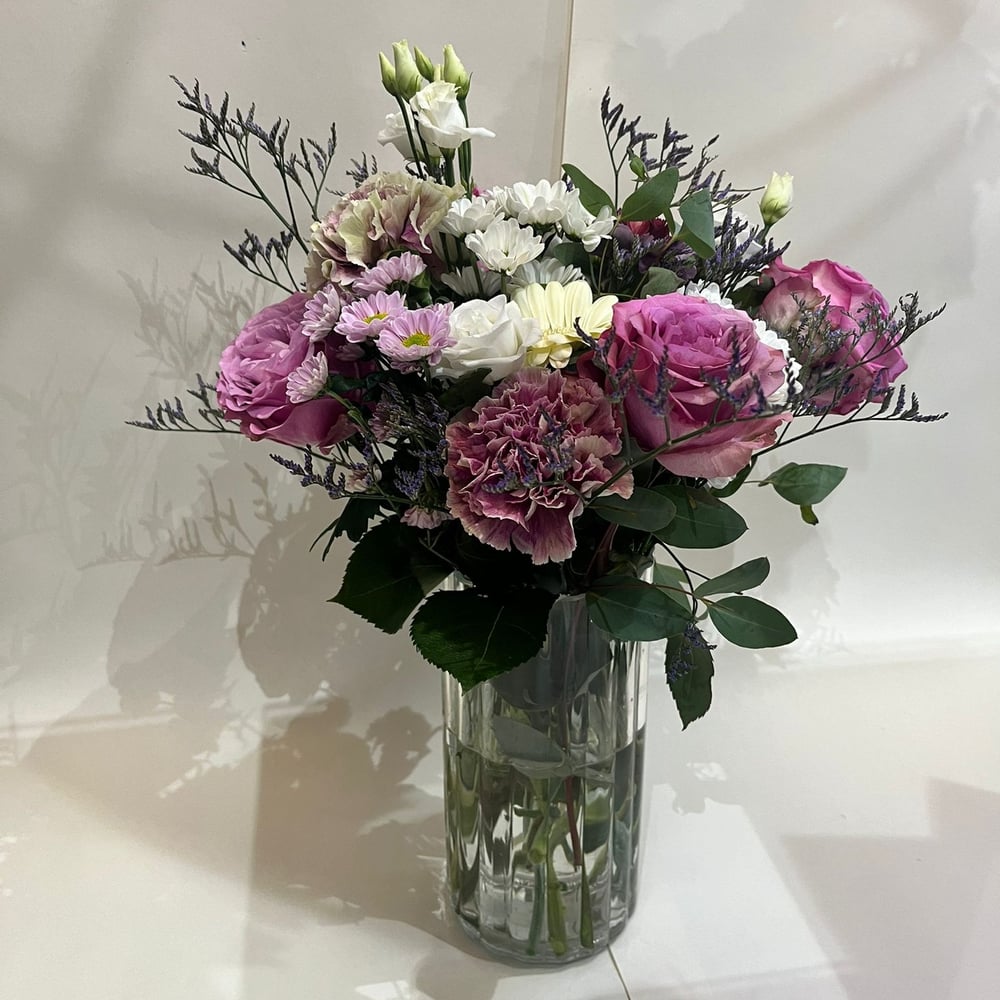 Like the first rays of dawn, this beautiful bouquet shines with soft colors in a glass vase