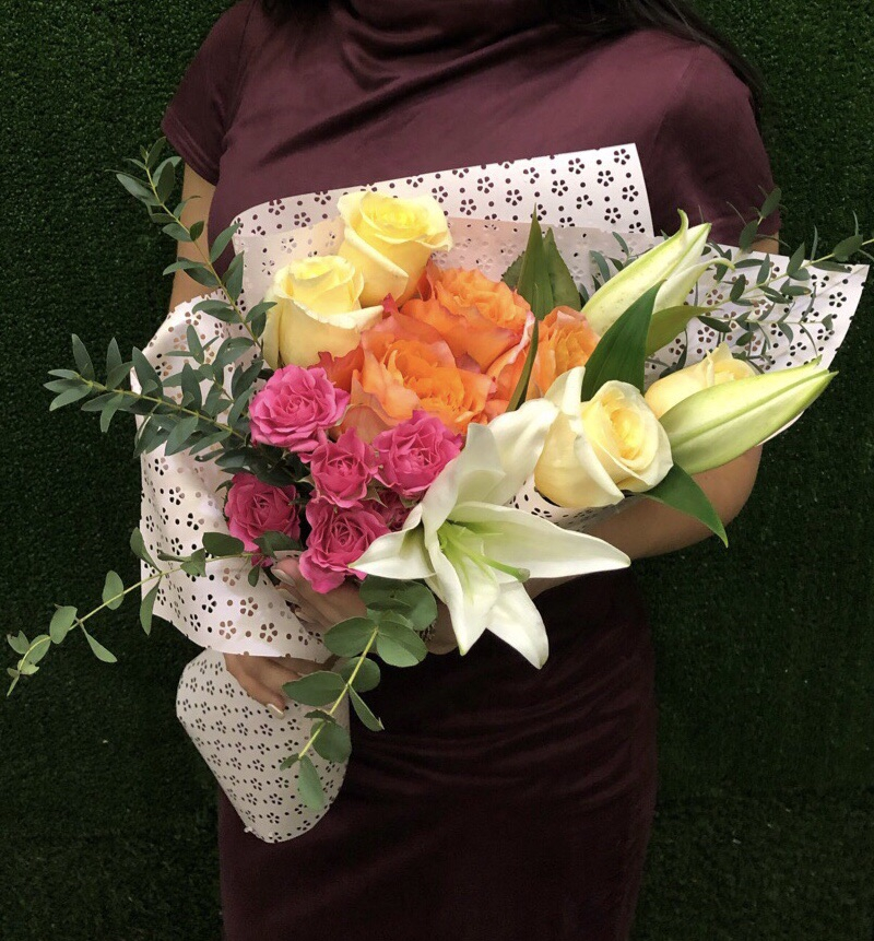 Non-classical bouquet with lilies and roses