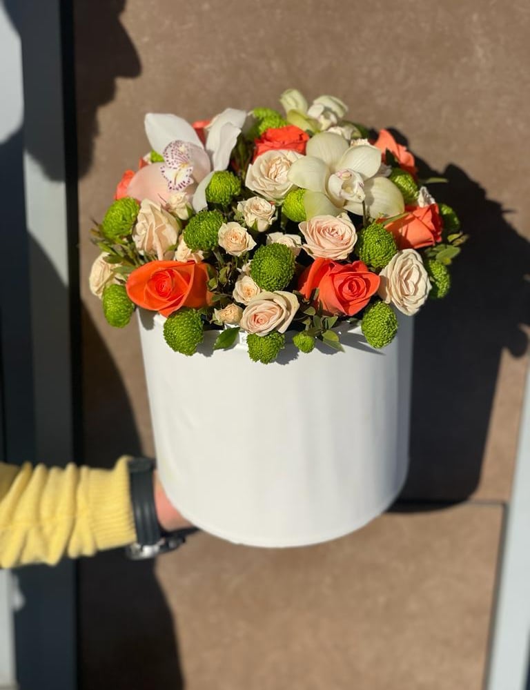 Hat box with flowers 'Orange happiness'