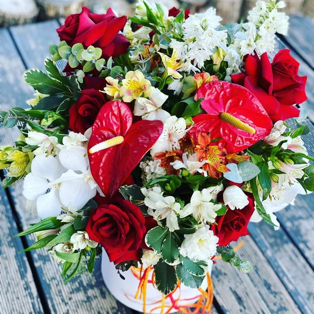 Hat box with flowers 'Orchid and Anthurium Premium'