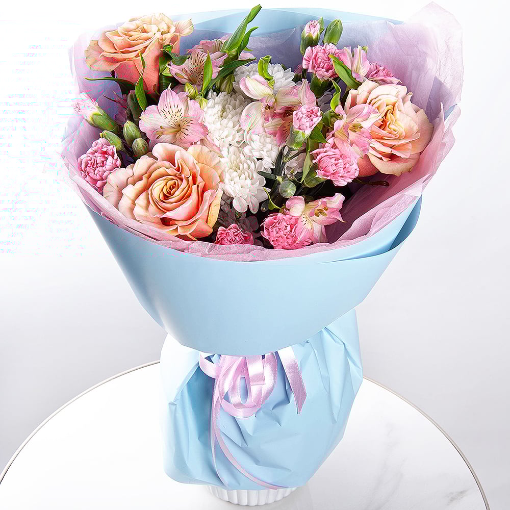 A warm and radiant bouquet featuring spray chrysanthemums, soft cream roses, gentle spray carnations, and delicate alstroemeria. Wrapped in contemporary packaging and tied with a satin ribbon, this bouquet embodies affection, making it a delightful gift for any occasion.