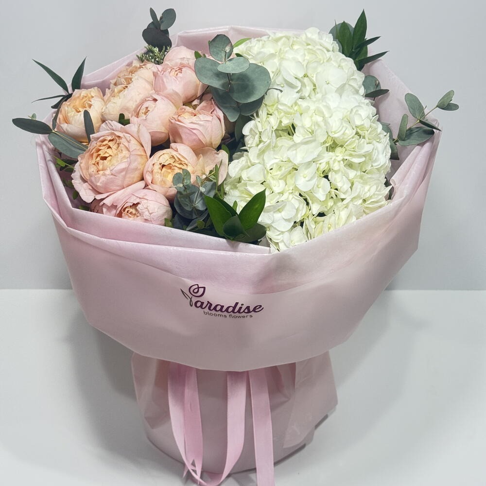 white hydrangea - 2 pcs peony type spray roses - 5 pcs