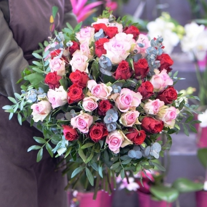 This bouquet of roses is made with red roses and pink roses of selected varieties, accompanied by varied foliage (according to our supplies), carefully by our florists to offer you vibrant colors. ...