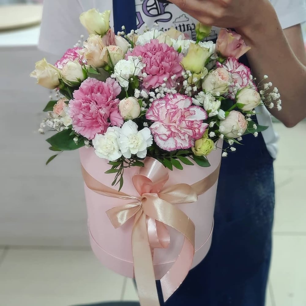 Hat box with flowers 'Pink breeze'