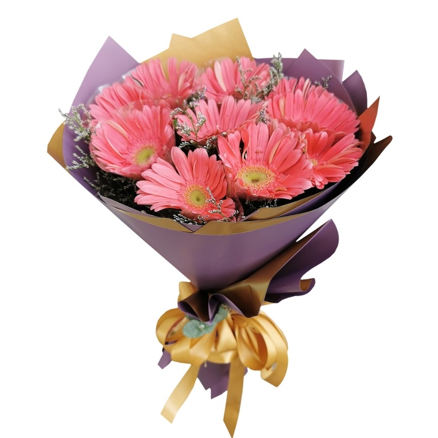 10 stems of pink gerberas in a bouquet.