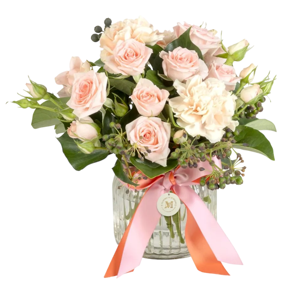 Pink Rose Vase Arrangement Pink Rose Posy is a gorgeous flower arrangement delivered in a glass vase overflowing with light and bright seasonal blooms. This petite flower arrangement is filled with pink roses, carnations and ivy berry and presented with pink and coral ribbon. To personalise your gift for any occasion, add a Miffy or chocolates. Available in 3 sizes.