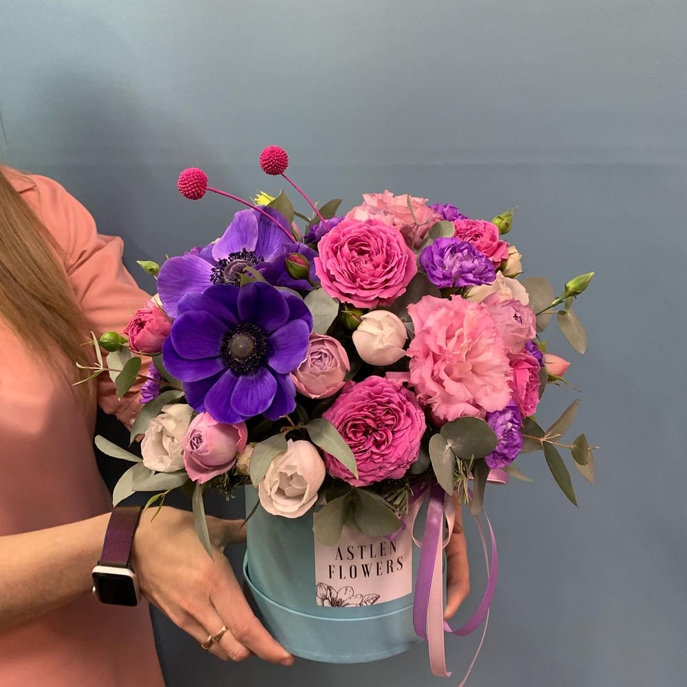 Hat box with flowers 'Purple delight'