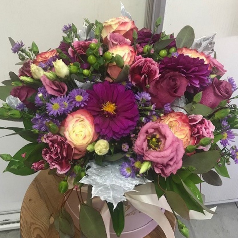 The purple composition in the hatbox is admirable and maddening with the aroma of fresh flowers