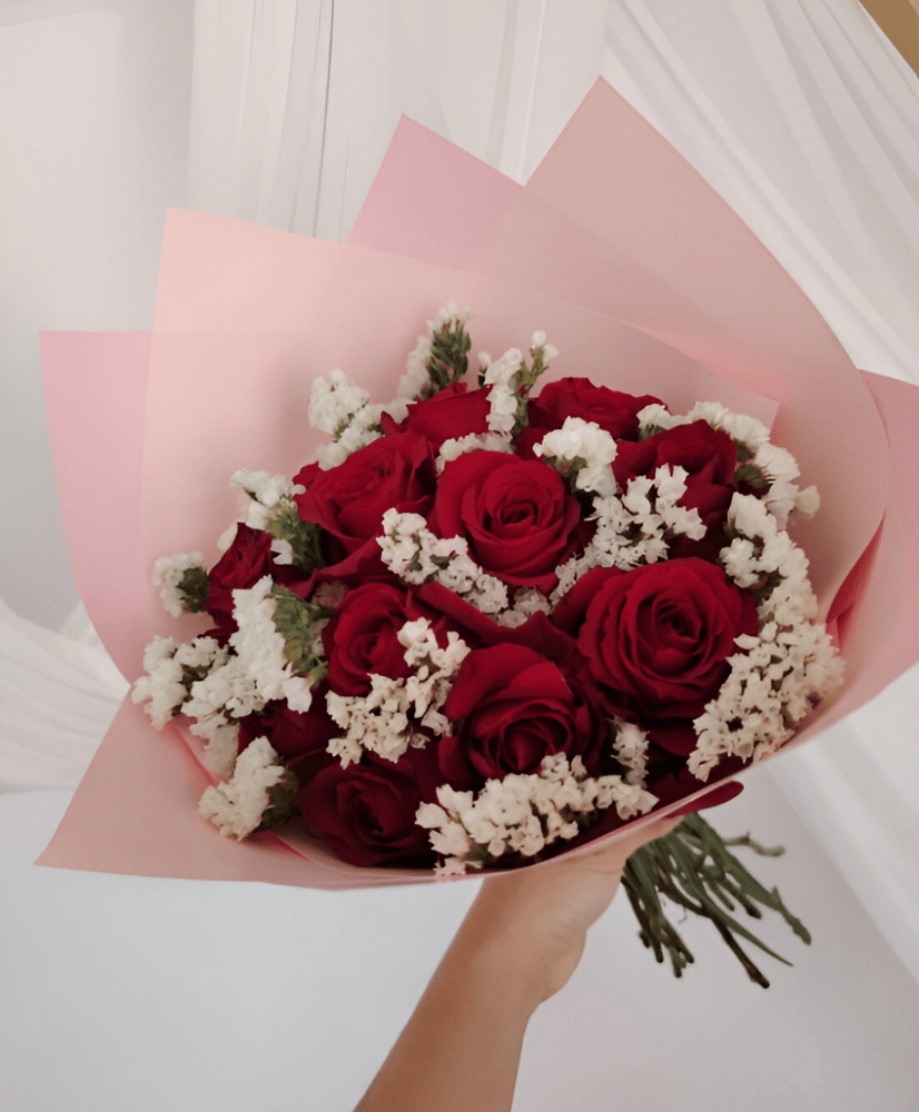 A classic bouquet of red roses that expresses passion, deep love, and feelings that endure over time. 🌹✨ Floral arrangement: Pink roses, pink carnations, pink alstroemerias Note: Reference image. Flowers and the color of the Korean paper are subject to seasonal availability.
