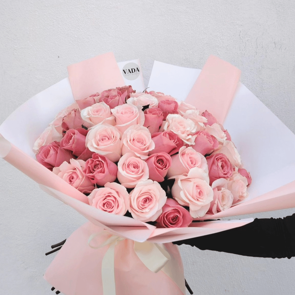 Delicate bouquet of pink roses, a symbol of tenderness, sweetness, and sincere love. ๐๐ธ Floral arrangement: 48 pink roses in various shades Note: Reference image. Flowers and the color of the Korean paper are subject to seasonal availability.