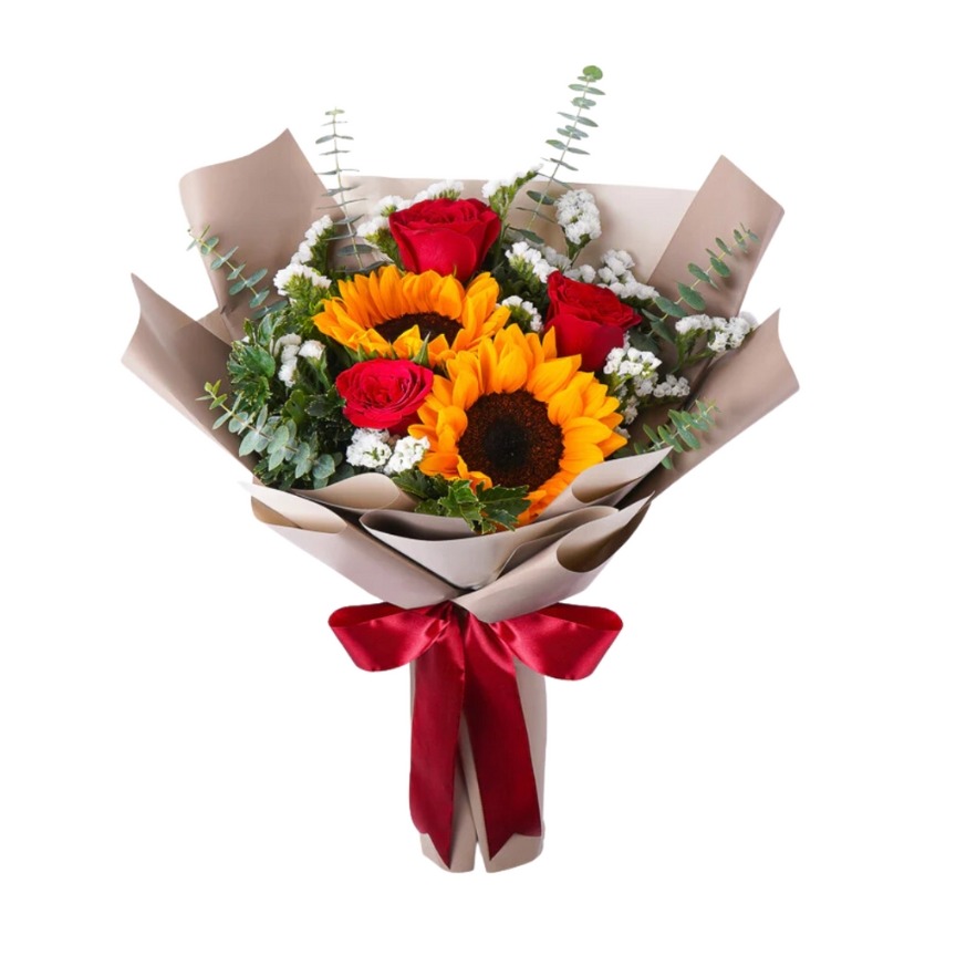 2 stems of sunflower and 3 stems of red roses in a bouquet.