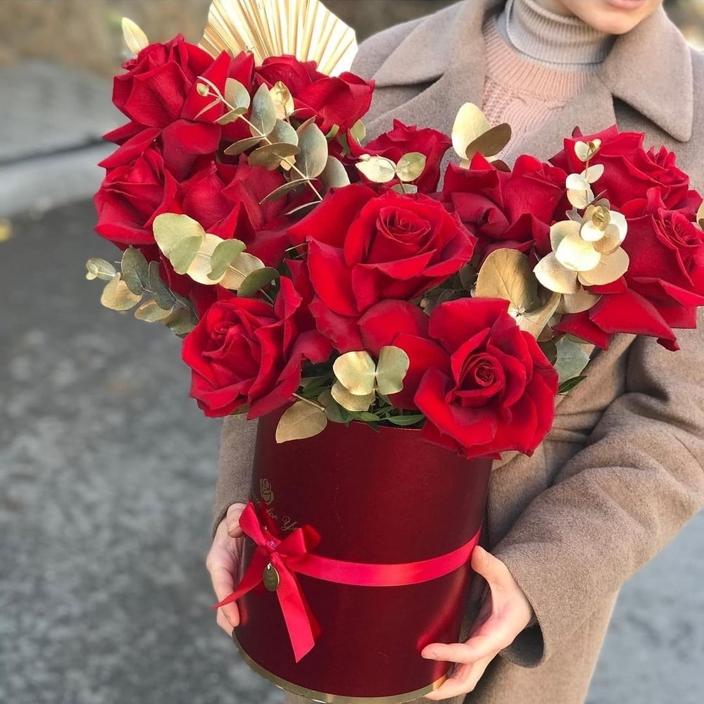 Hat box with flowers 'Red gold'