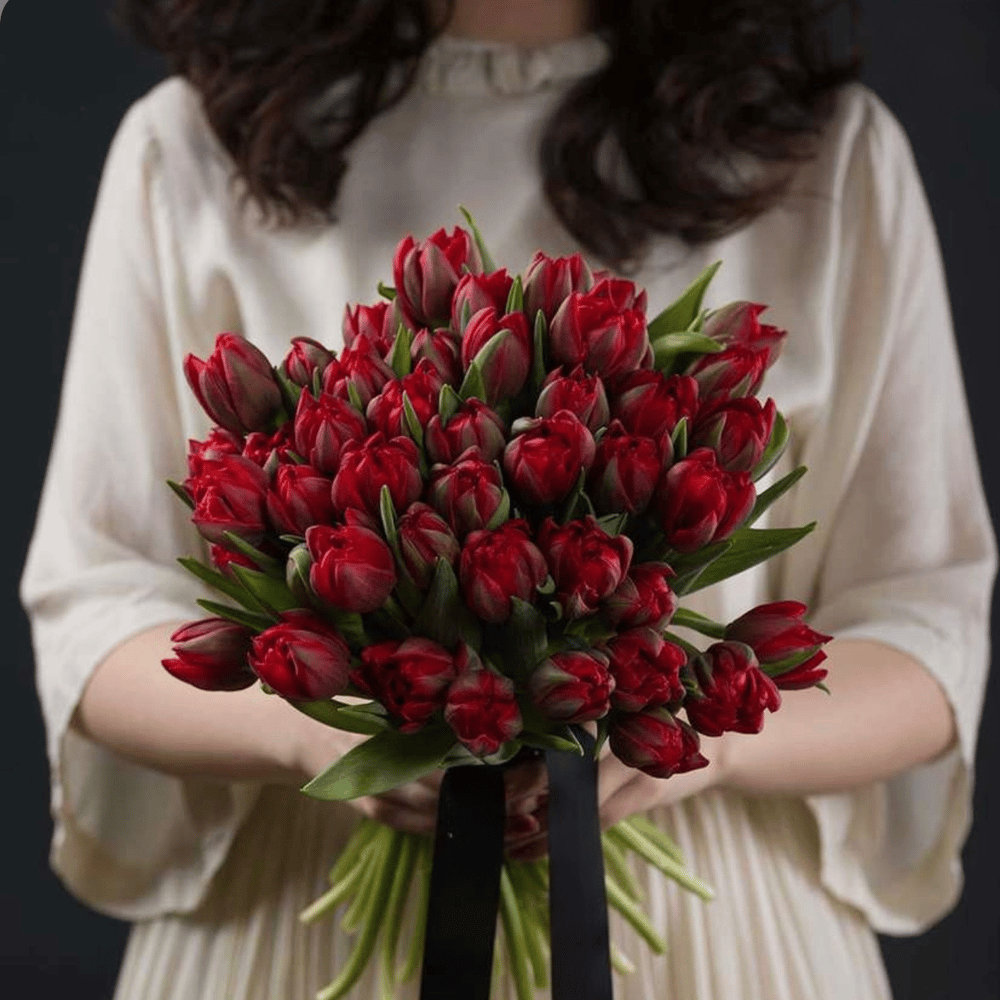 A bold, elegant bouquet of deep red tulips, hand-tied for a refined, couture look. Rich color, flawless shape, and a sleek black ribbon — pure luxury in your hands.