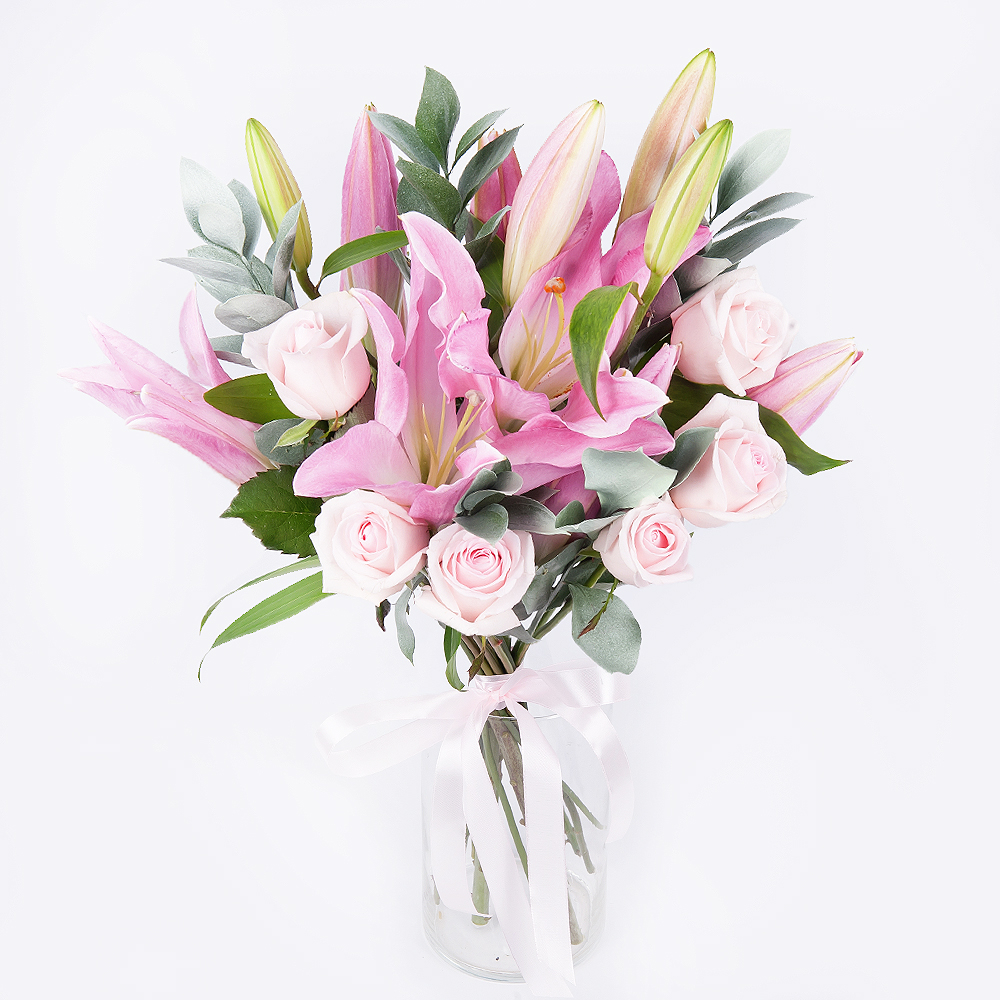 This bouquet is a perfect expression of tenderness and care. With its combination of Pink rose, Lily, and Ruscus, it represents the purest form of love and affection. The modern packaging gives it a sleek and elegant look, making it a perfect gift for someone you care about deeply.