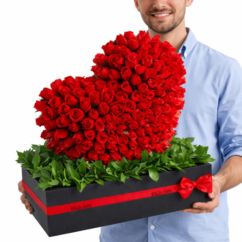 One Side heart Shape of Red Roses Box Arrangement. One Side Heart Shape 100pcs Red Roses with Greenary/Gypsy in Box Arrangement and Red ribbon bow. Black Square Box Arrangement. Free Personalised Message Card.(if you have any message) N.B.: Message Card design may be vary. Also we will Try Exact flowers if not available than we can use others flowers but same value.