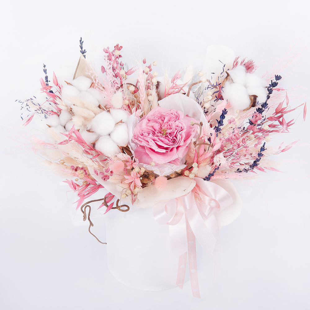 The "Rose Quartz" bouquet in a box is a delicate and exquisite combination of peony-like roses, dried flowers, and cotton buds that will give the recipient a feeling of lightness and airiness. The ...