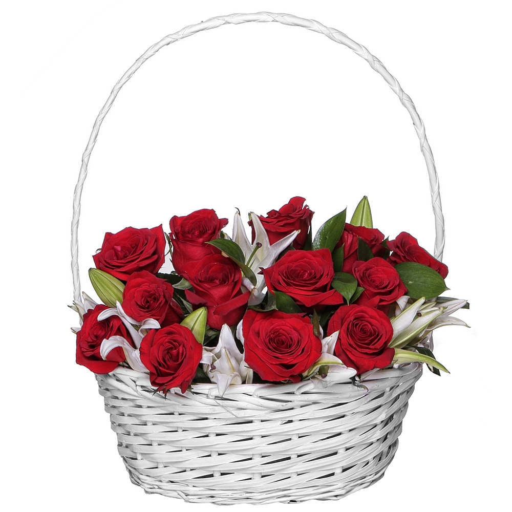 This beautiful bouquet consists of elegant lilies, bright red roses 50 cm in length, and fresh ruscus. The flowers are arranged on sturdy floral foam, which ensures that the flowers will remain fresh for a long time and can fully reveal their potential. The flower bouquet is delivered in a medium-sized basket, which serves not only as a beautiful finish but also as a convenient place for the recipient to store it. Surprise your loved ones with this lovingly created bouquet of flowers and bring beauty and joy into their everyday life.