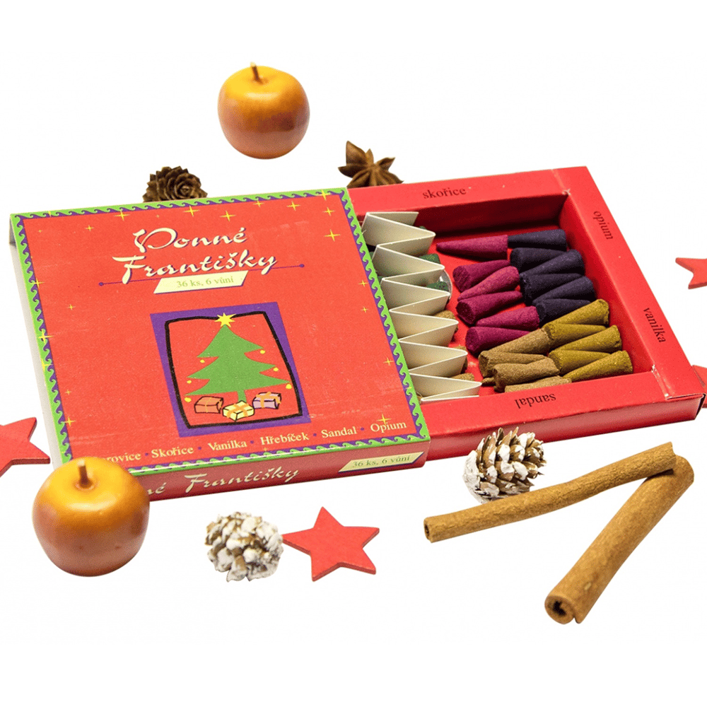 Scented incense cones, 36 pieces in a box with six types of fragrances (pine, cinnamon, vanilla, clove, sandalwood, opium). These incense cones will create a magical Christmas atmosphere.