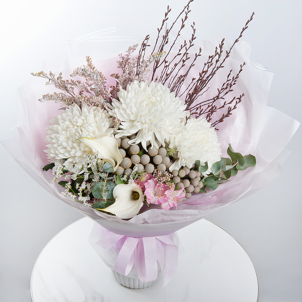 Incredible beauty of silver dreams in the colors of this beautiful bouquet. Silvery chrysanthemums, shining callas, bright alstroemerias, mysterious ozothamnus, and limonium merge into the most beautiful dream. Brunia and eucalyptus perfectly complement the bouquet and create an exquisite composition. Modern packaging and decorative branches add a special style to the bouquet, perfectly conveying your feelings.