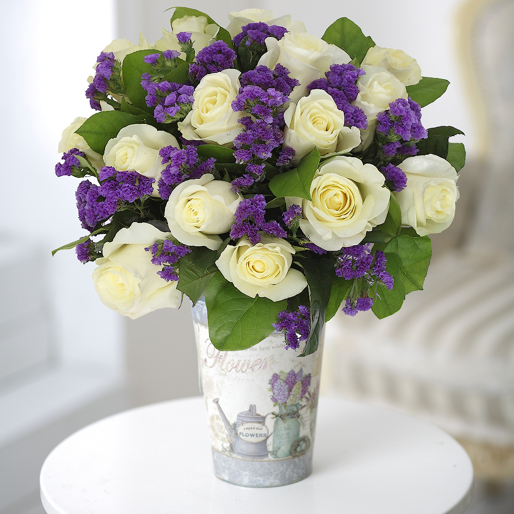 The classic combination of beautiful fragrant white rose and sapphire sea lavender. This is a beautiful bouquet for formal holidays and to congratulate your relatives, to express your attraction an...
