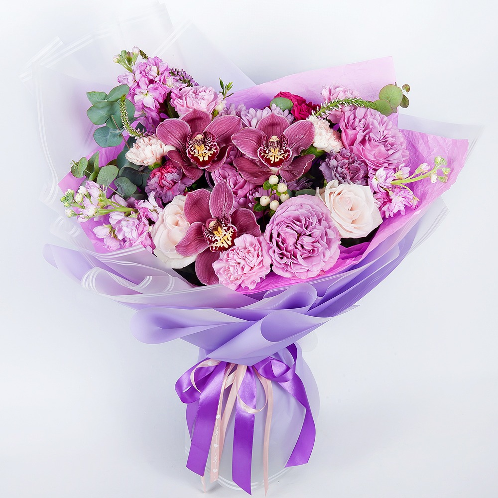 The bouquet "Sincere Happiness" is an embodiment of tenderness and harmony in lilac-pink shades. It is composed of the most exquisite flowers: stock, carnation, chrysanthemum, pink and purple roses, cymbidium orchid, veronica, eucalyptus, hypericum.